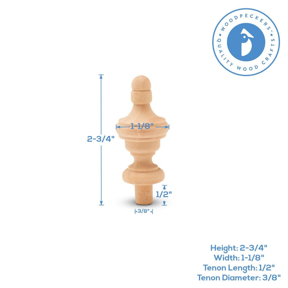 Make your next project more awesome -This small wood finial will add elegance to paper scrolls, DIY invitations and tassels. Are you building a birdhouse, dollhouse, or creating miniatures? This 2-3/4” tall finial, including the tenon, will give it the oomph you’re looking for!